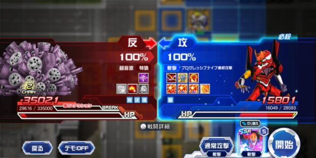 ex12までそのまんまの編成できとるんやが、カイザーでファイナル、ビーム、シンジさんは防御を37000まで上げて覚醒再動再動で陽電子、昇格ナイフ、昇格パレットでずっと俺のターンしてる。ex9まではそれで終了してた。ex12現在でシンジさんラッシュの後はアークの必殺一発当てれば終了。