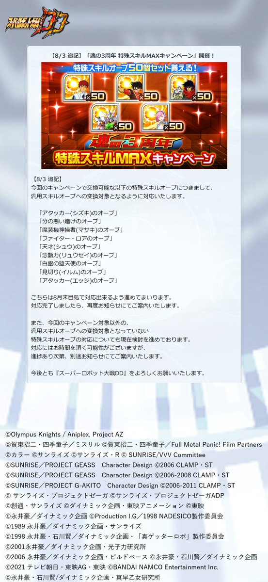 現在開催中の「魂の3周年 特殊スキルMAXキャンペーン」にて交換可能な特定の特殊スキルオーブを、汎用スキルオーブへの変換対象となるように対応いたします。