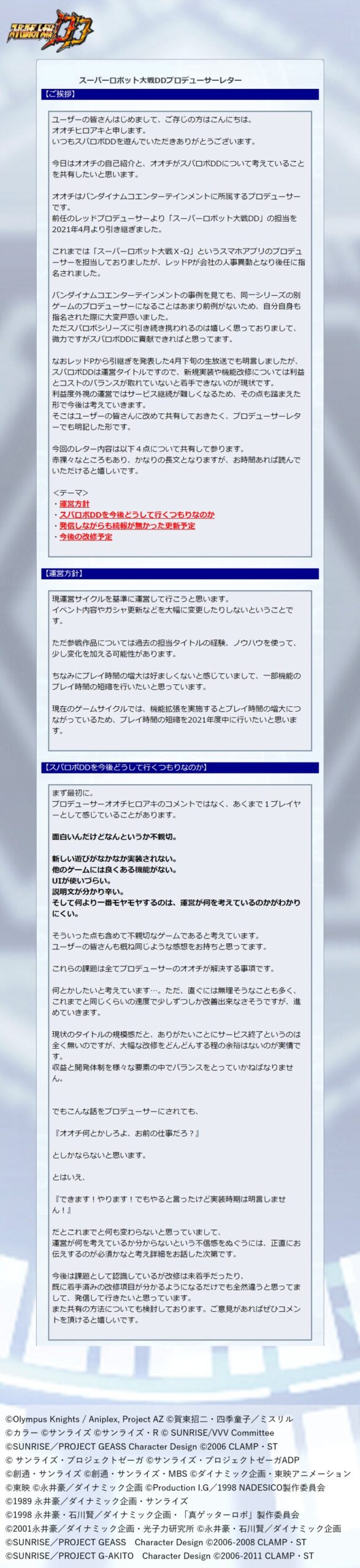 【朗報】スパロボDDの今後は!?プロデューサーレター公開キタ━━━(゚∀゚)━━━!!