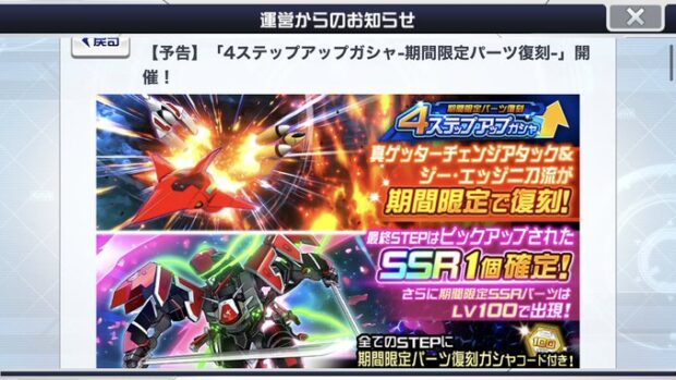 【ガシャ】1/13から「4ステップアップガシャ-期間限定パーツ復刻-」!!これは欲しい人はやるしかないww